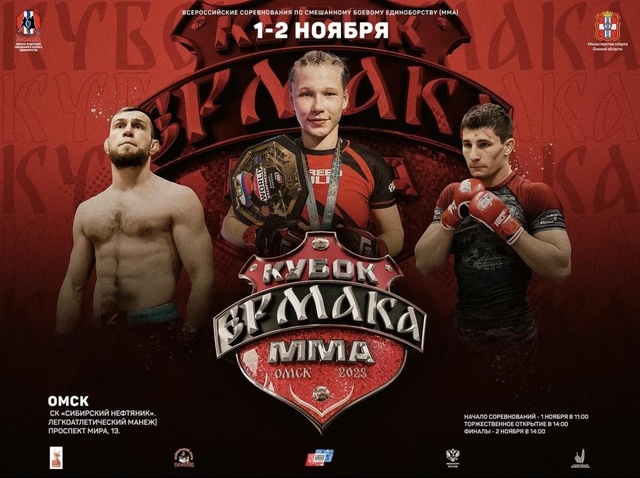 31октября - 03 ноября 2025 года в городе Омске на территории объекта спорта «Сибирский нефтяник. Легкоатлетический манеж», по адресу: г. Омск, пр. Мира, д. 13 состоятся Всероссийские соревнования по смешанному боевому единоборству (ММА) «Кубок Ермака»